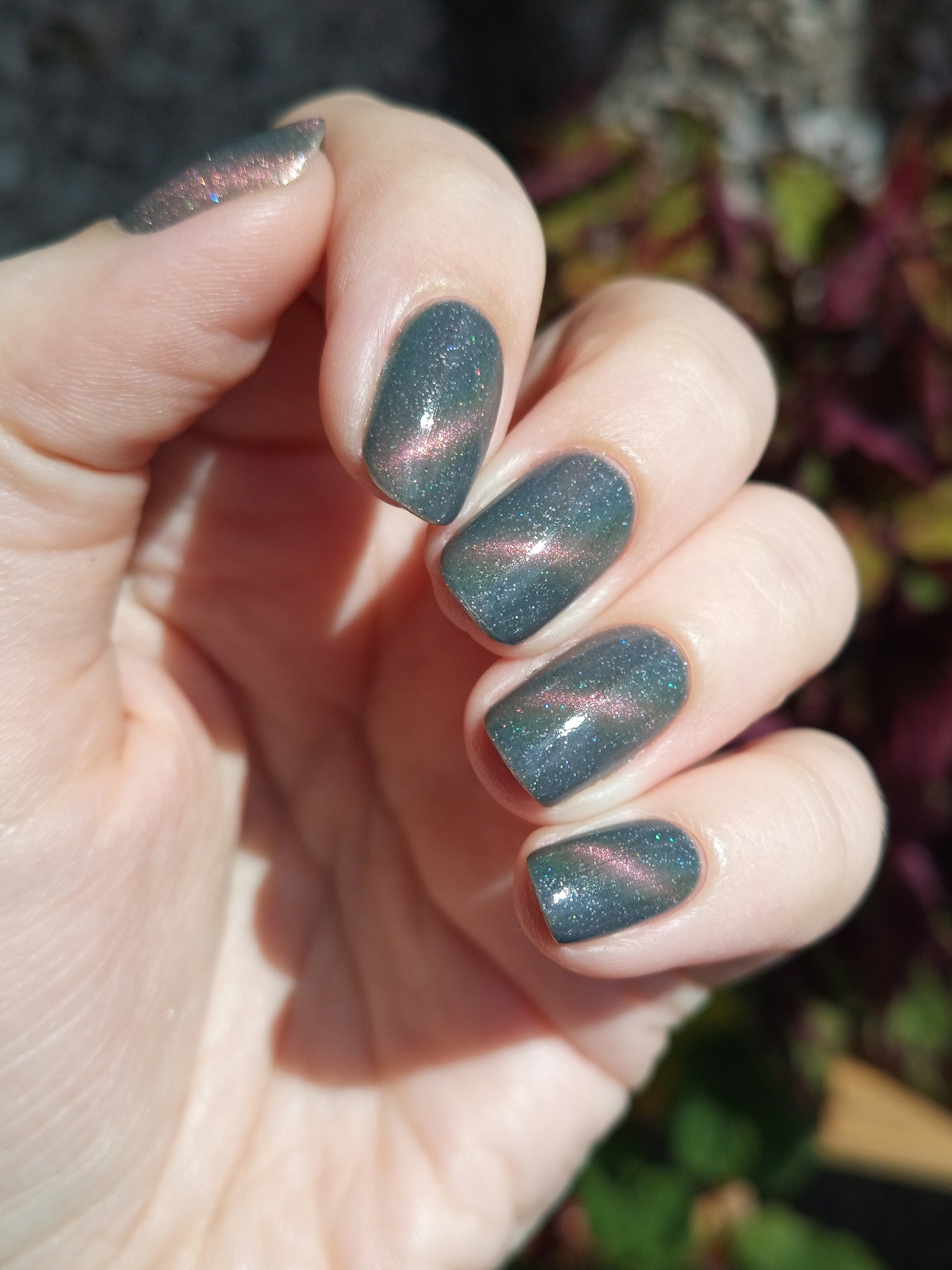 Серое желе с черным микрошиммером, голографическим микроглиттером и оранжево-красно-зеленым магнитным шиммером.