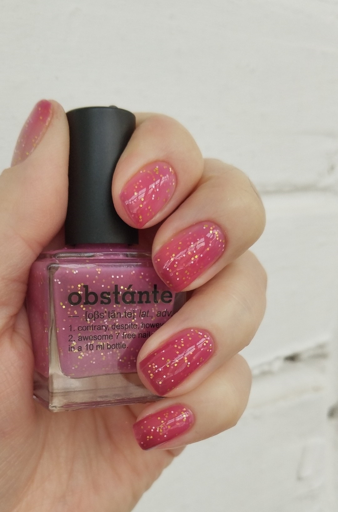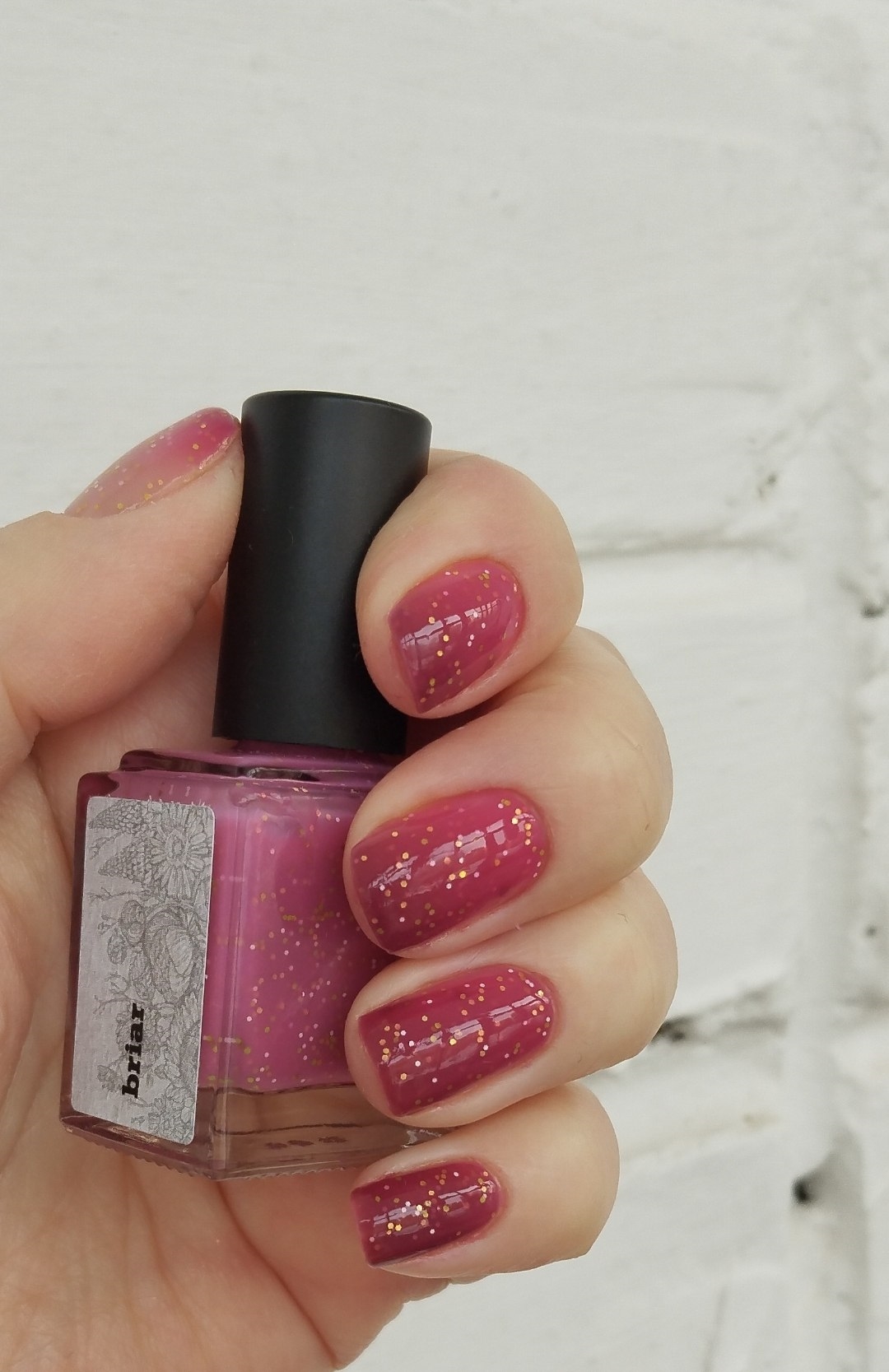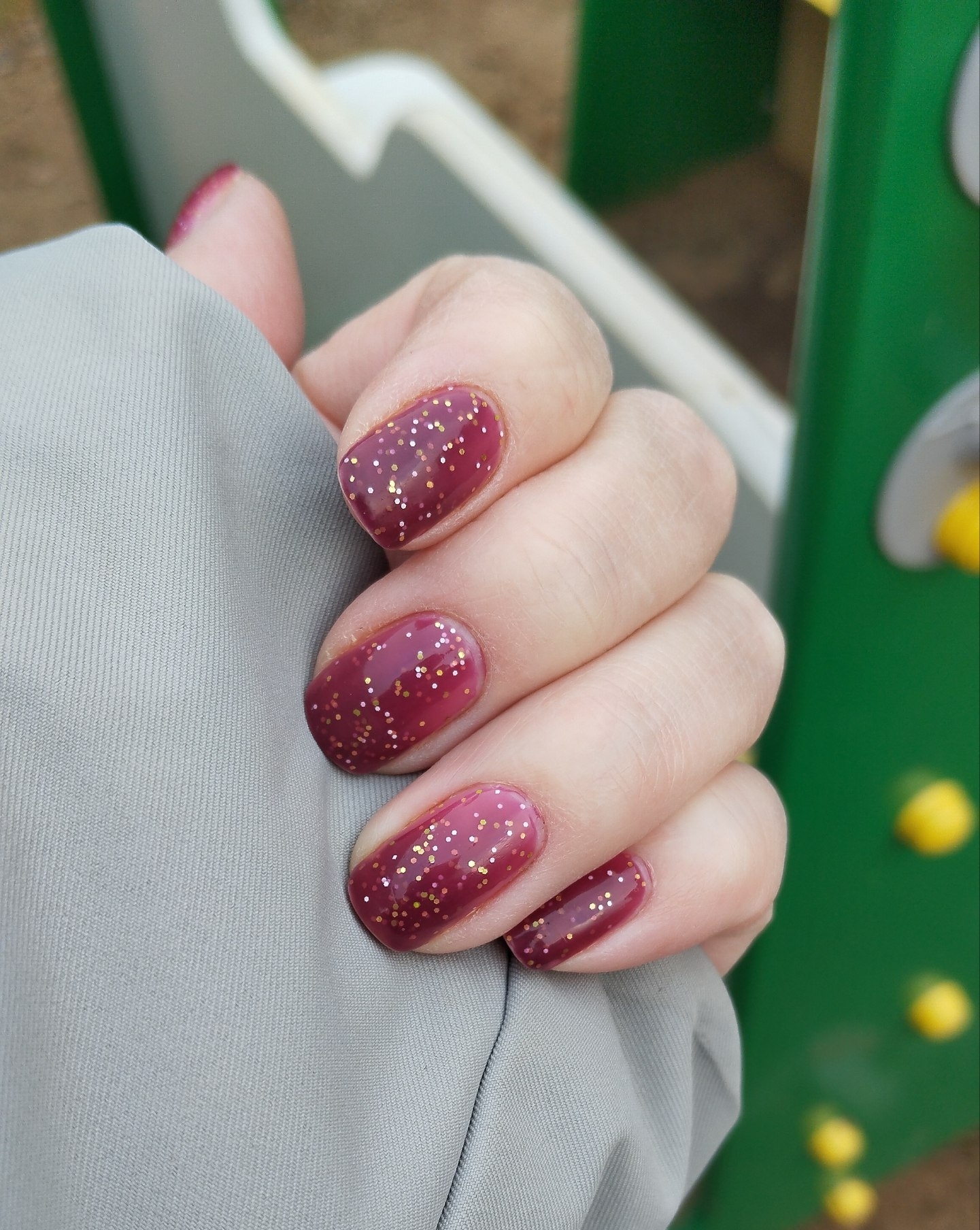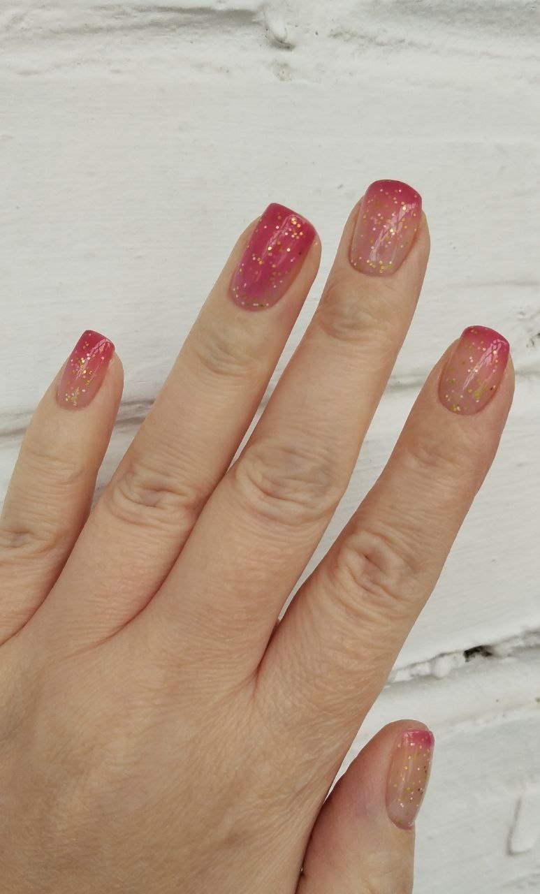 Нюдовый в тепле, розовый в переходном состоянии и бордовый на холоде термолак с белым, салатовым и золотым мелким глиттером.