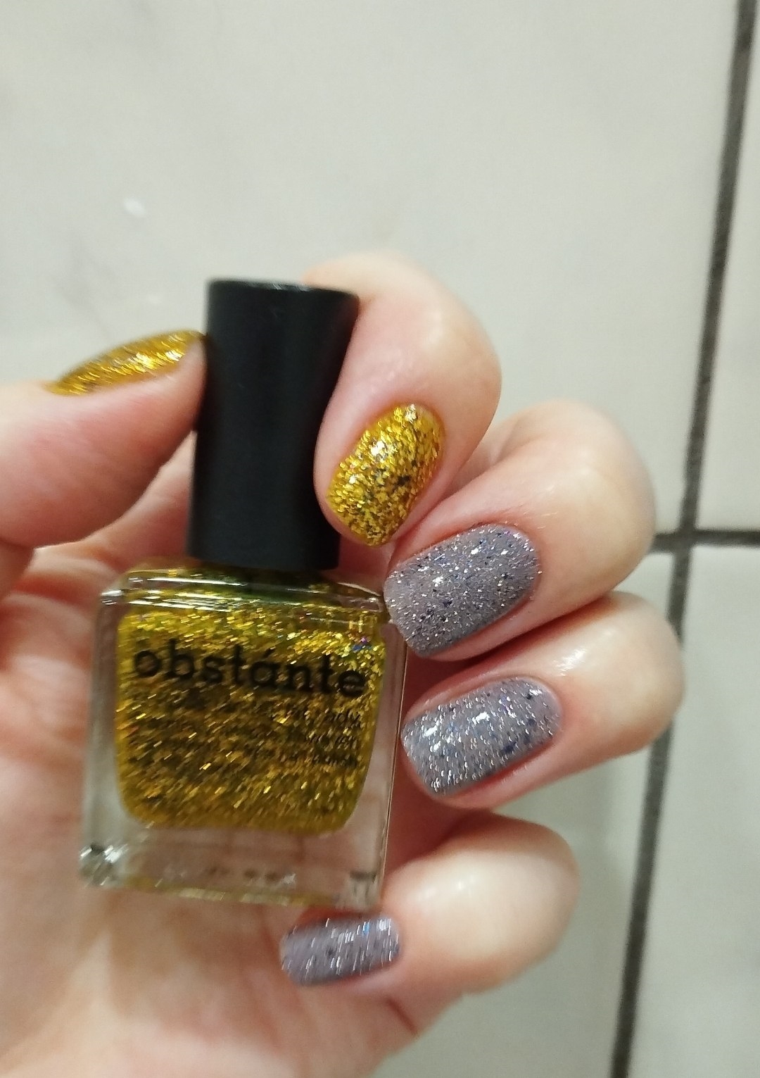 Желтое желе с золотой поталью и мультихромной сине-фиолетовой и бирюзово-голубой слюдой.