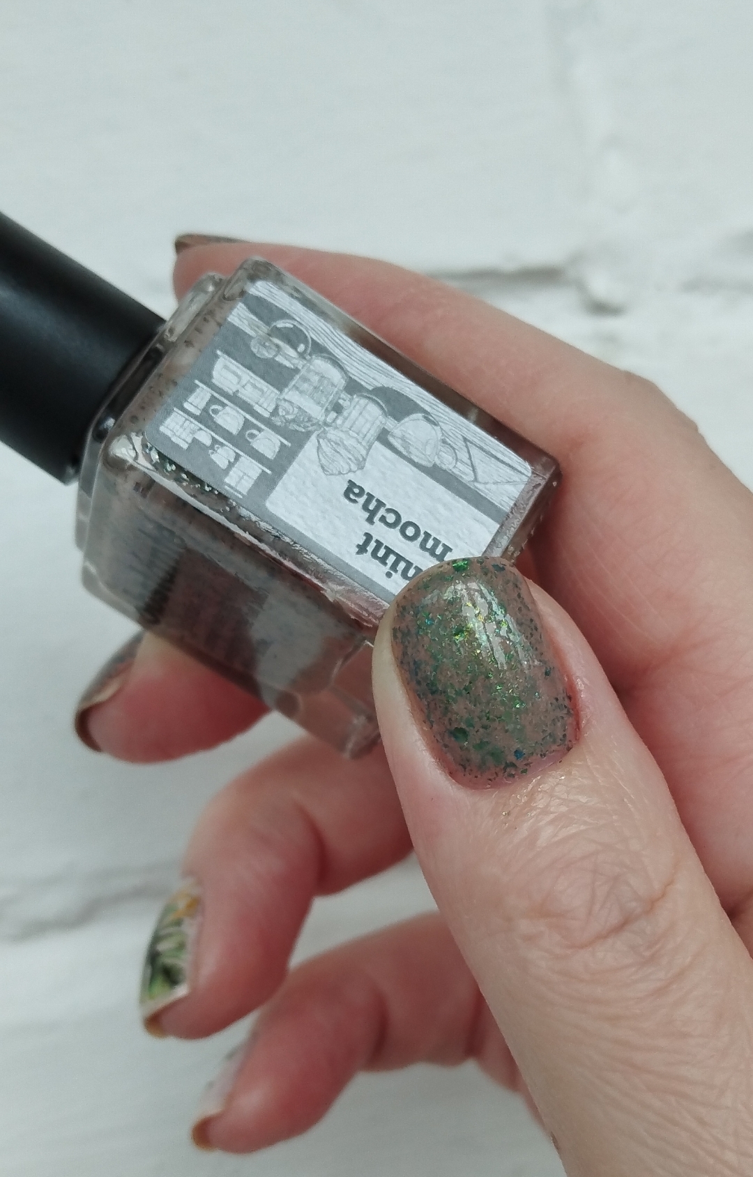 Креле цвета молочного шоколада с крупным зеленым шиммером и мультихромной зелено-салатово-бирюзово-синей слюдой.
